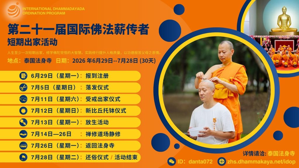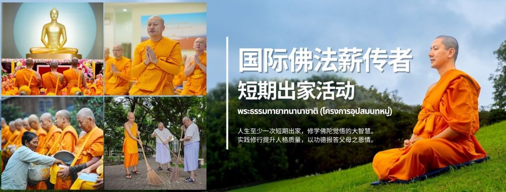 短期出家,体验出家人的生活,是一个极具挑战性,并且将令人终生难忘的经验。来自各个国家的佛法薪传者们共聚一堂,深入体验佛教文化、学习南传佛教的初级佛法教义、练习静心打坐、认识修身养性的方法,利用这段珍贵的清净修行期间,找到自己生命的答案。